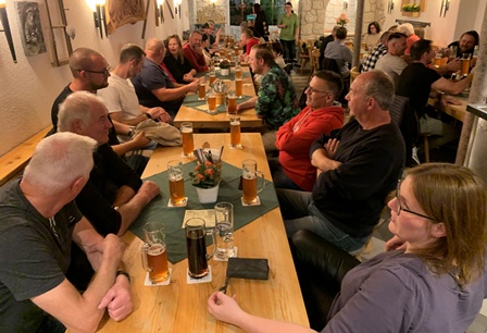 Eine wacklige und unfallträchtige Sitzbank ließ unseren Zimmerer und Ruheständler Franz Haberkorn keine Ruhe. Ein Akku-Schrauber war schnell zu Stelle, der Schaden konnte zur vollsten Zufriedenheit vom Wirtshauschef Hans fachmännisch behoben werden. Die stabilisierten Sitzgelegenheiten verhinderten dann ein zu frühes Aufbrechen, so manche Zoiglhalbe verschwand bis Mitternacht noch in den durstigen Kehlen. Zwischenzeitlich kümmerte sich Schnupftuchwartin Antonia um das Wohlergehen des neu beschafften Schalob-Schweinderls, denn nicht alle hatten das Schnupftuch als obligatorisch mitzuführendes Markenzeichen des Clubs zur Hand. Kurz nach Beginn des neuen Tages war es aber soweit, die Schnupftuchler verließen ausreichend durstgestillt und etwas wohlgenährter den eigentlich zum noch längeren Verweilen einladenden Kouhsdol und ließen sich sicher mit dem Bus nach Hause bringen. Vergnügungswart Reinhold Biller hatte sich um die Vorarbeit bestens gekümmert, so dass der Abend ohne besonderen Zwischenfälle verlief und alle zufrieden und wohlbehalten zu Hause ankamen.