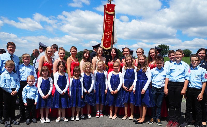 Festdamen, -mädels und -burschen der FFW Spielberg warten auf den Start des Festzuges.