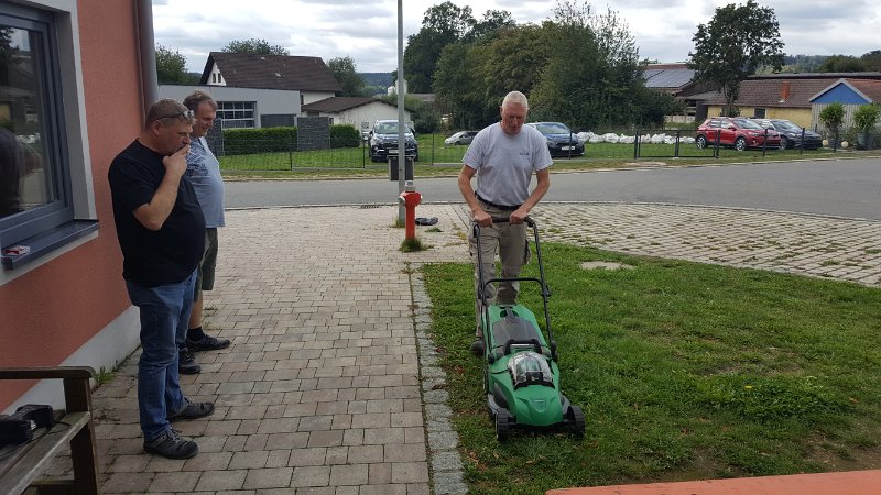 Vor dem Aufbau des Anbauzeltes ist Rasen mähen angesagt.