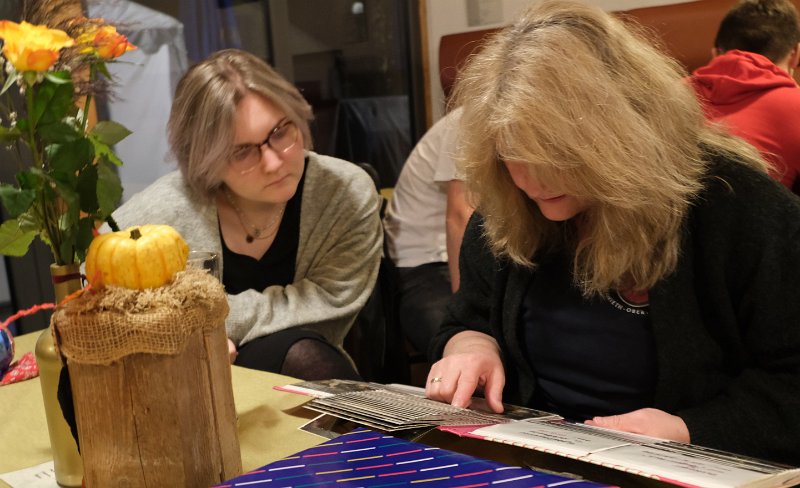 Die Schalob-Fotografin Renate hat einige Kisten mit Bilder aus dem Schalob-Leben mitgebracht, Christa und ihre Tochter Antonia staunen über die vielen Schnappschüsse.