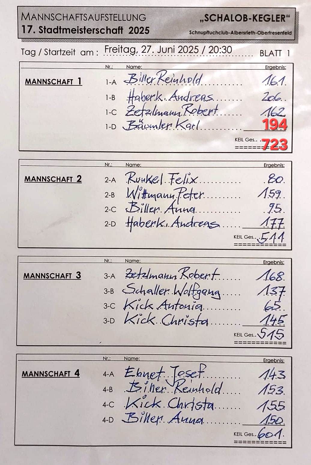 vom Vergnügungswart zusammengestellten vier Schalob-Mannschaften sammelten