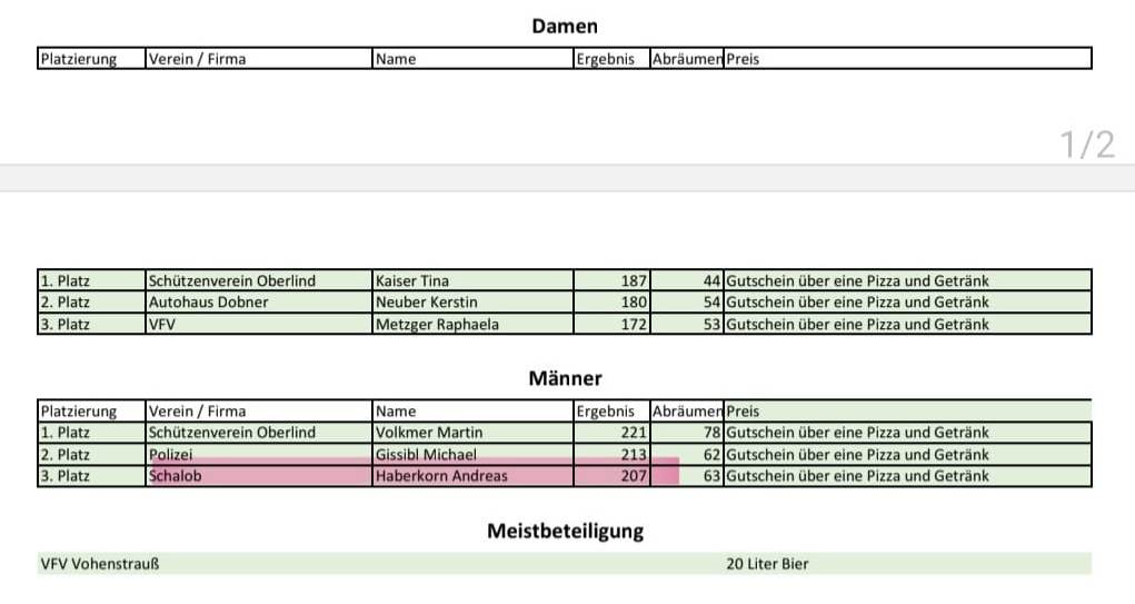 Mit einem Abstand von nur 4 Holz zum zweitplatzierten Team ("Tina und die drei Schönen" vom Schützenverein Oberlind) holte sich die Mannschaft von Schalob 1 den Sieg (=> Siegerurkunde). Platz 3 ging an die Polizeiinspektion 1 aus Vohenstrauß (=> Auszug aus Ergebnisliste). Unter den besten Einzelergebnissen schaffte es Andy Haberkorn vom Team Schalob 1 auf einen überragenden dritten Platz. Bei der Siegerehrung, die im Rahmen des Keglerfestes beim "TriffNix" am Feiertag Maria Himmelfahrt über die Bühne ging, nahm Vergnügunsgwart Reinhold Biller die Siegerurkunde und den Gutschein für die Sachpreise (3 Kasten Bier und eine große Pfanne Leberkäse) in Empfang.