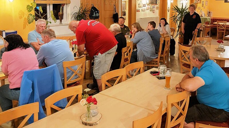 Vizepräsidentin Christa Kick (stehend am Ende des Tisches) begrüßt im TriffNix die Kegelrunde des Schalob.